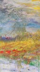 2013In het landschap vallen de rode bloemen op. In het schilderij is ook gewerkt met zand om nog meer effect te bereiken op de grond en in de lucht.